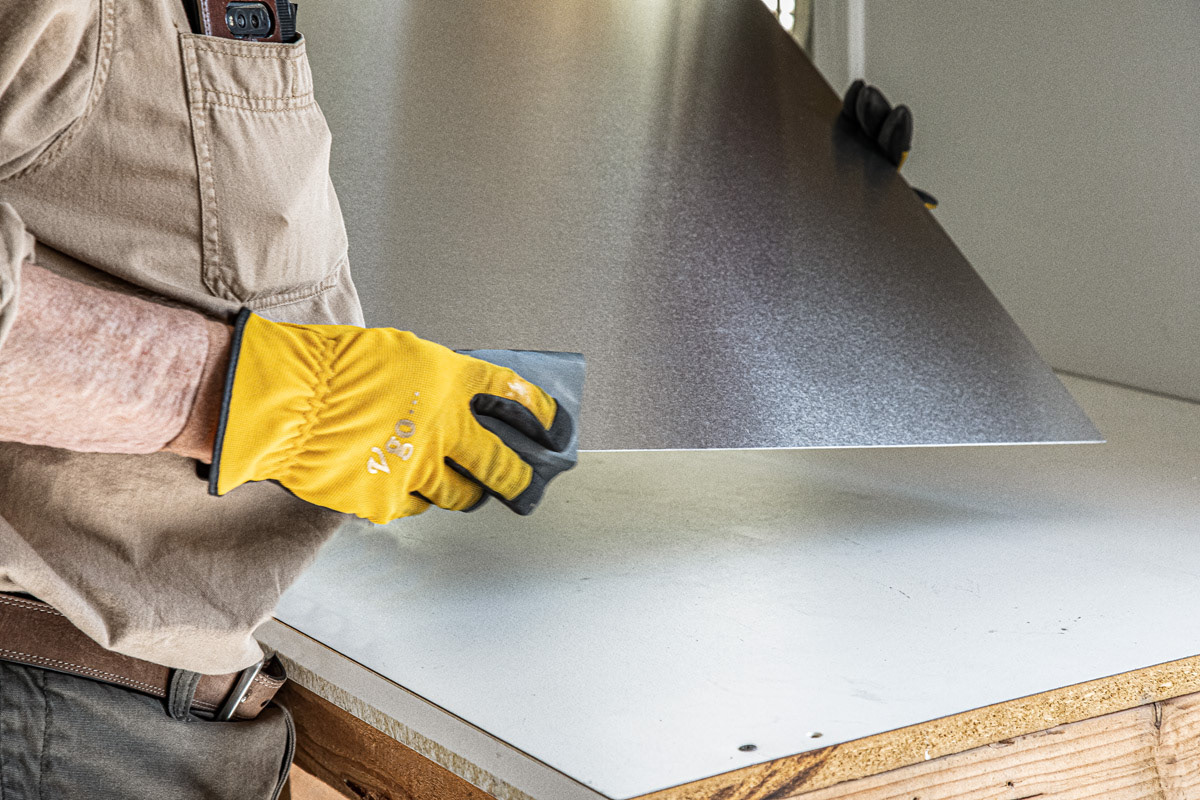 Once I have a print fit for myself and my patrons, I prepare a .040 aluminum panel I had cut to my standard size (right now I am only doing a few 18" x 24" panels, later other sizes will be available) which I prepare to receive the print. This requires brushing the adhesive side to make a good bond and filing and then sanding the edges with fine emery cloth to remove burrs and make rounded corners. After this, it will be ready to a print mounted on it.