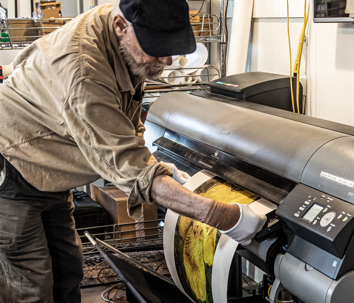 Printing is a multi-step, somewhat complex process that starts with making proof prints until the desired print is produced. Realizing that what I see on a screen that transmits light, can in no way be the same as what one sees on a printed piece using reflected light, I still try to get as close as possible. Thus proofing is essential to put the FINE in fine art reproduction. Color, density, reflectivity, saturation and other nuances make choosing the right substrate for the finished work quite a challenge. After hundreds of tests, proofs and research, I have decided on reproducing this work on the very heavy weight, highly textured, yet glossy, Hahnemuhle photo rag metallic paper. The proofing and choice of substrate to print on, is the most important part of the process to bring you a work that satisfies my rather picky needs and provides the people who like my work enough to buy it the highest quality I am able to produce. After I have a good print I spray multiple coats of a special coating to further protect the print from moisture and UV rays (this does not make the print "waterproof", but makes it more archival). I am hardly a factory grinding out thousands of prints each day with only superficial attention to details and real respect for what that means to the rendering for the artist. "Good enough" is not good enough for me.