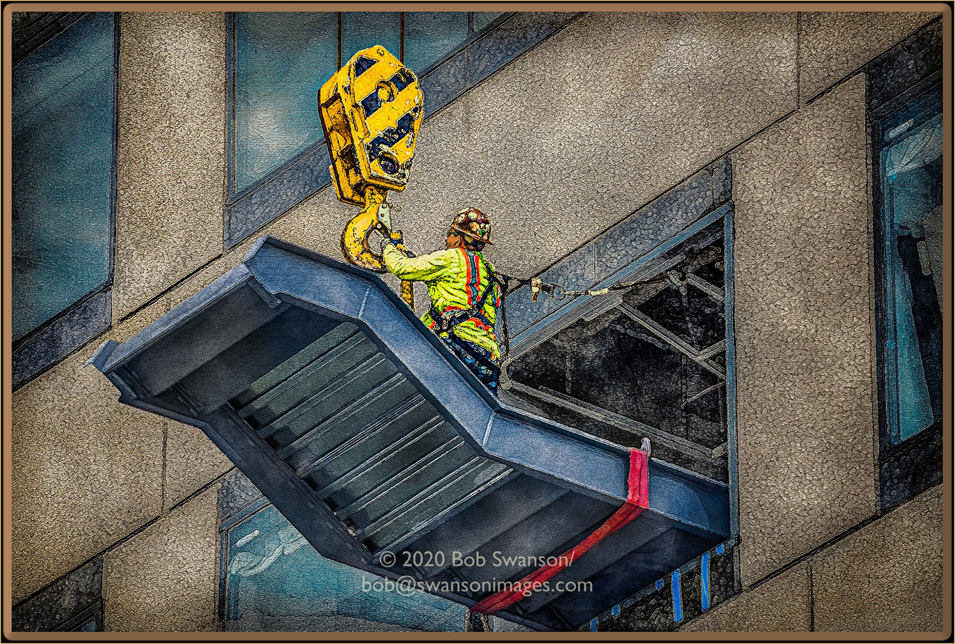 Stairing at Work Unhooking the stair one hundred feet up, hanging, helpless to tons of steel. The iron of your will enjoys a moment of exhilaration before the inevitable humdrum evaporates your soul.