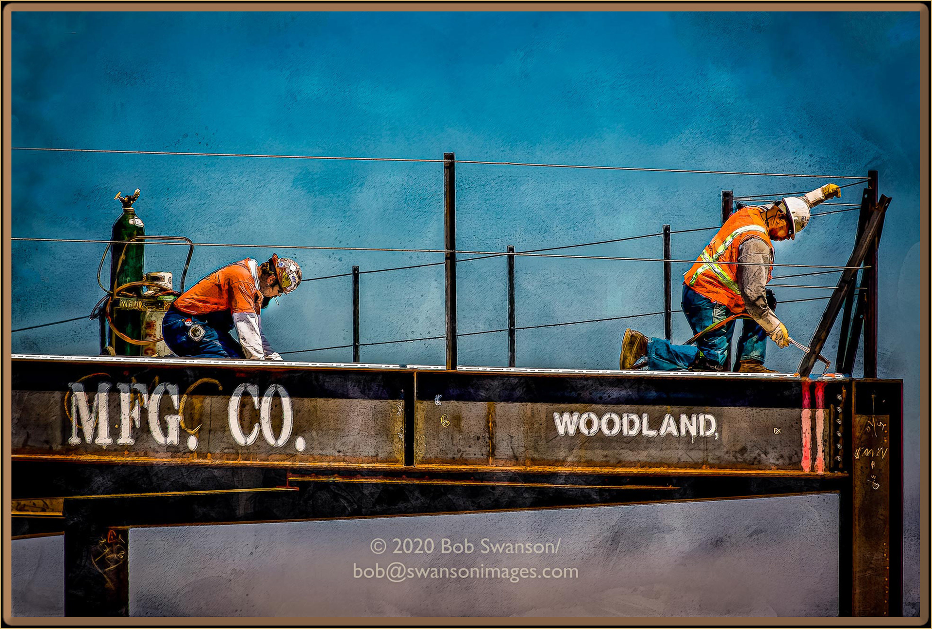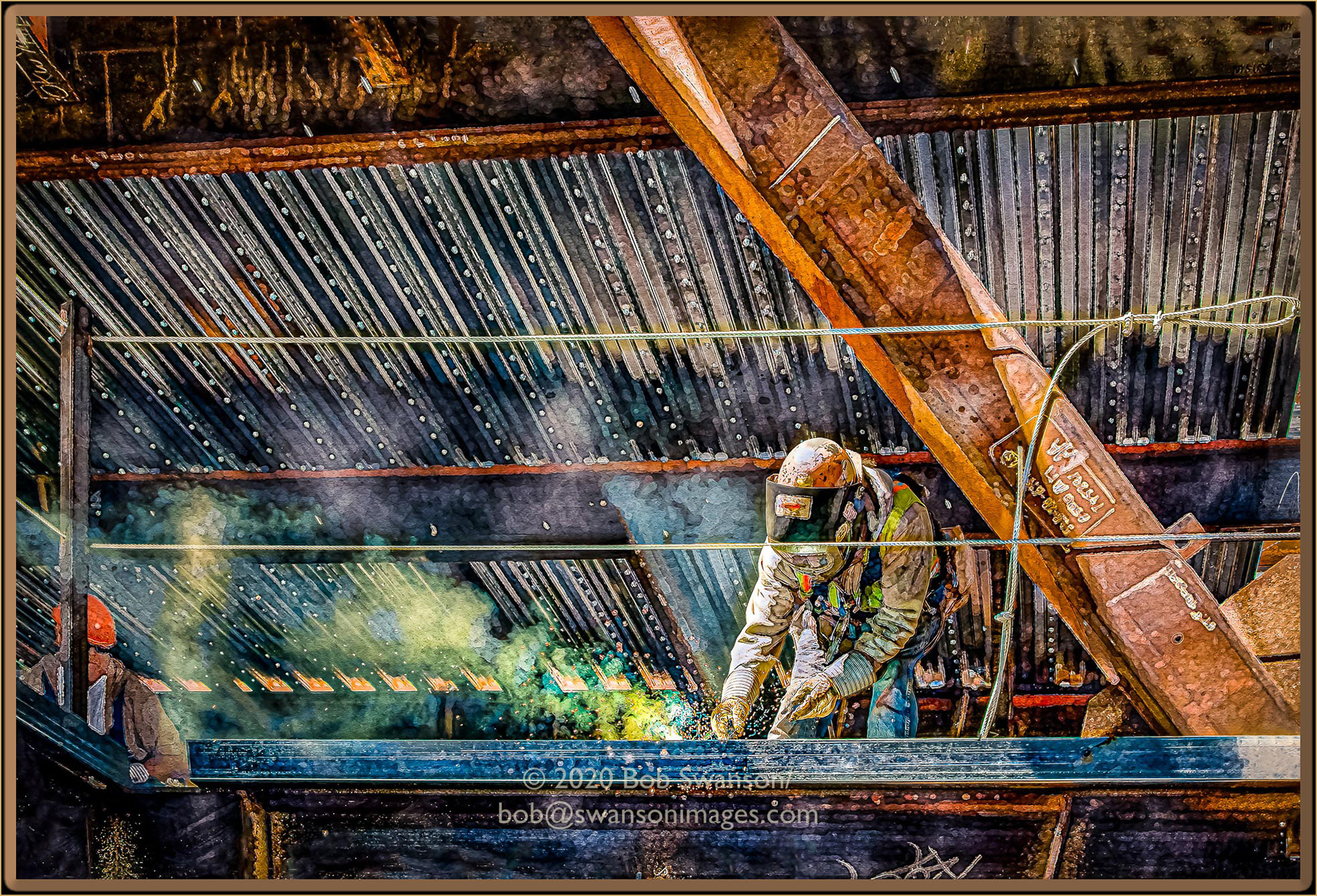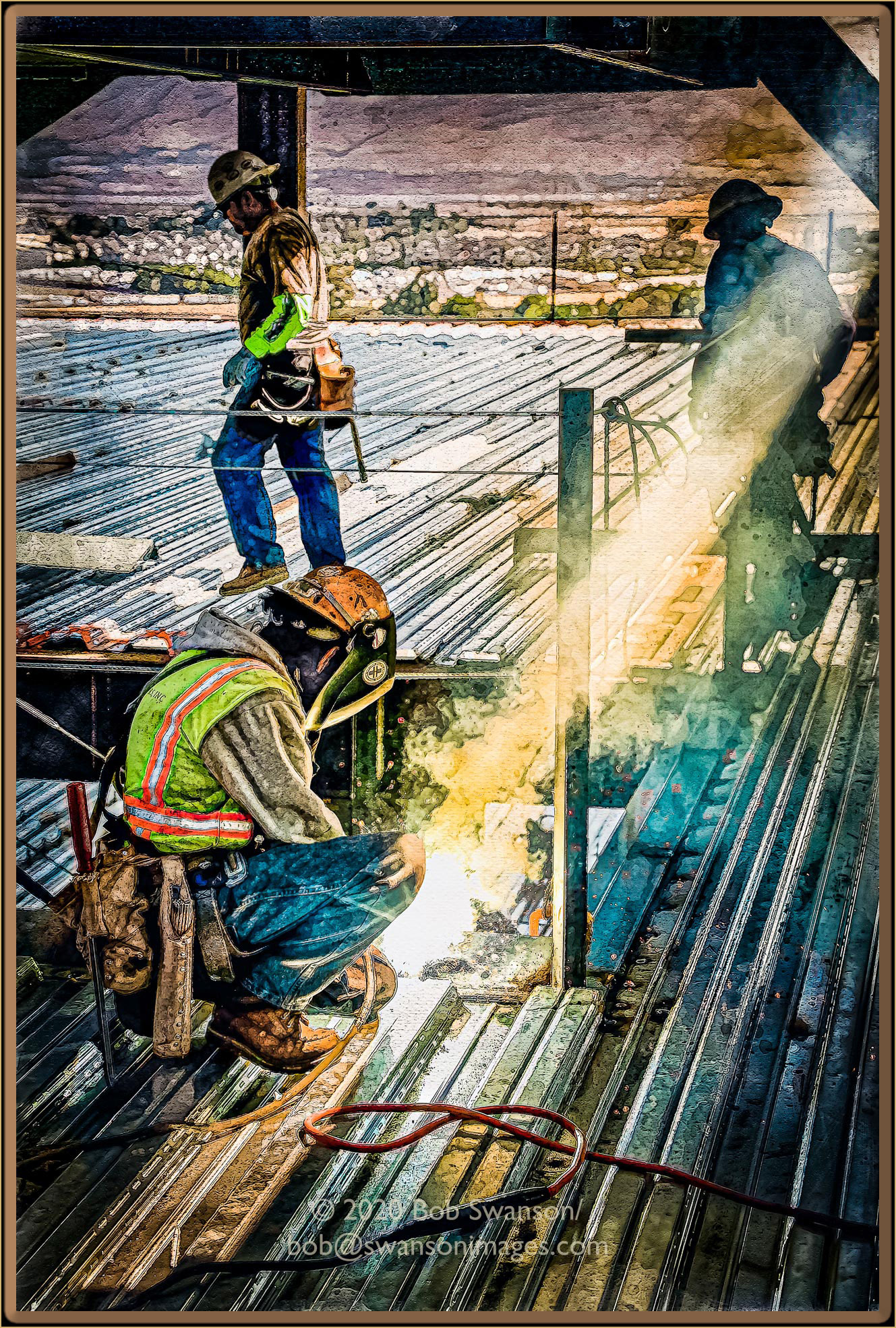 Smoking Sunbeam The sun strikes the already too bright to look at welding flash, as acrid smoke rises and the bond is made. The iron workers seem milling around, but that does not belie the tasks that preoccupy them. Progress is made, the cost, the payment, the value ever growing, ever crumbling.
