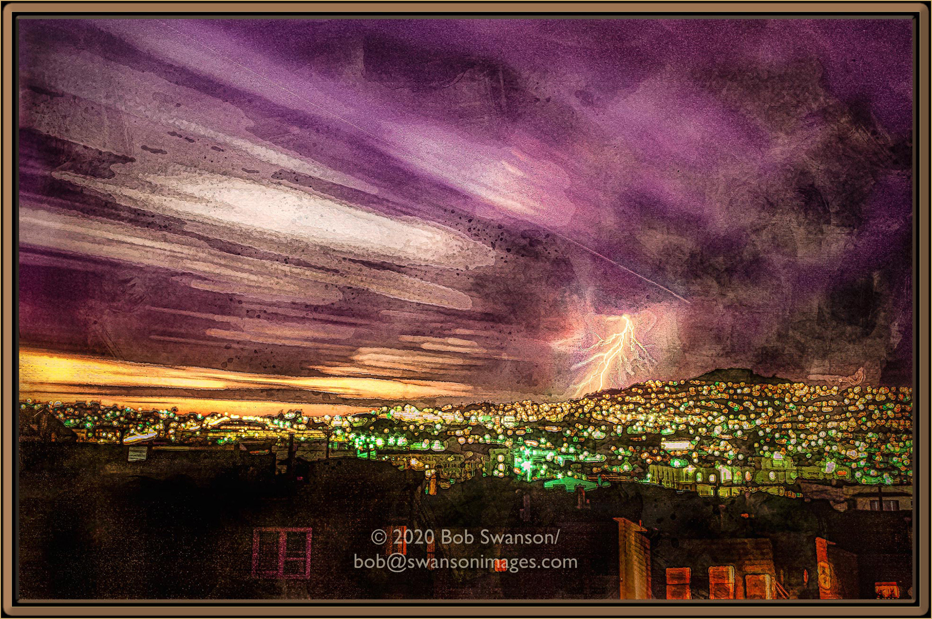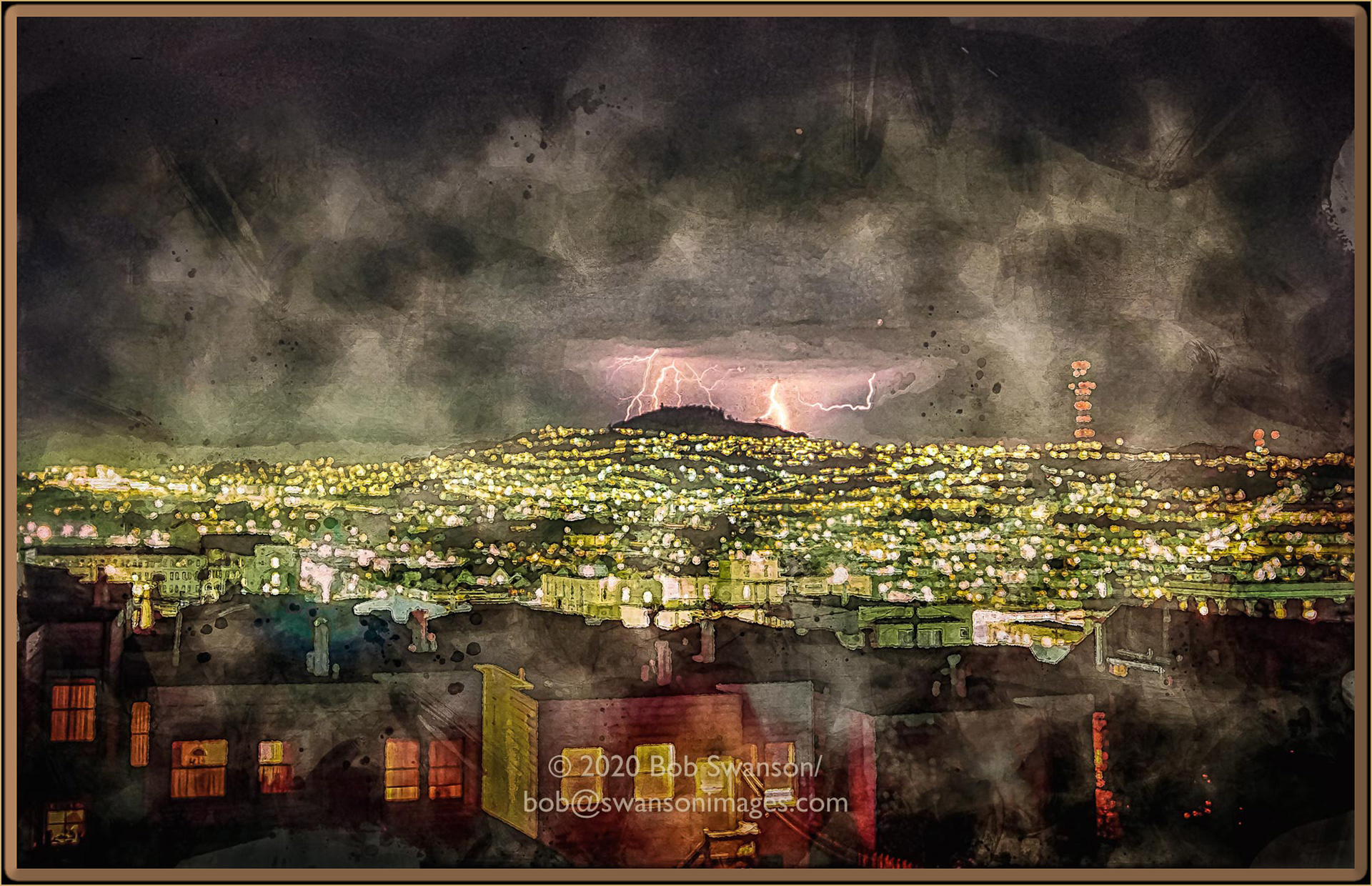 Lightning My Life Electrical city spread out before me, taking a gigantic spark on the mountain with the tower, The beauty of the sunset is overpowered by the majesty of the almighty encroachment into the neighborhood.
