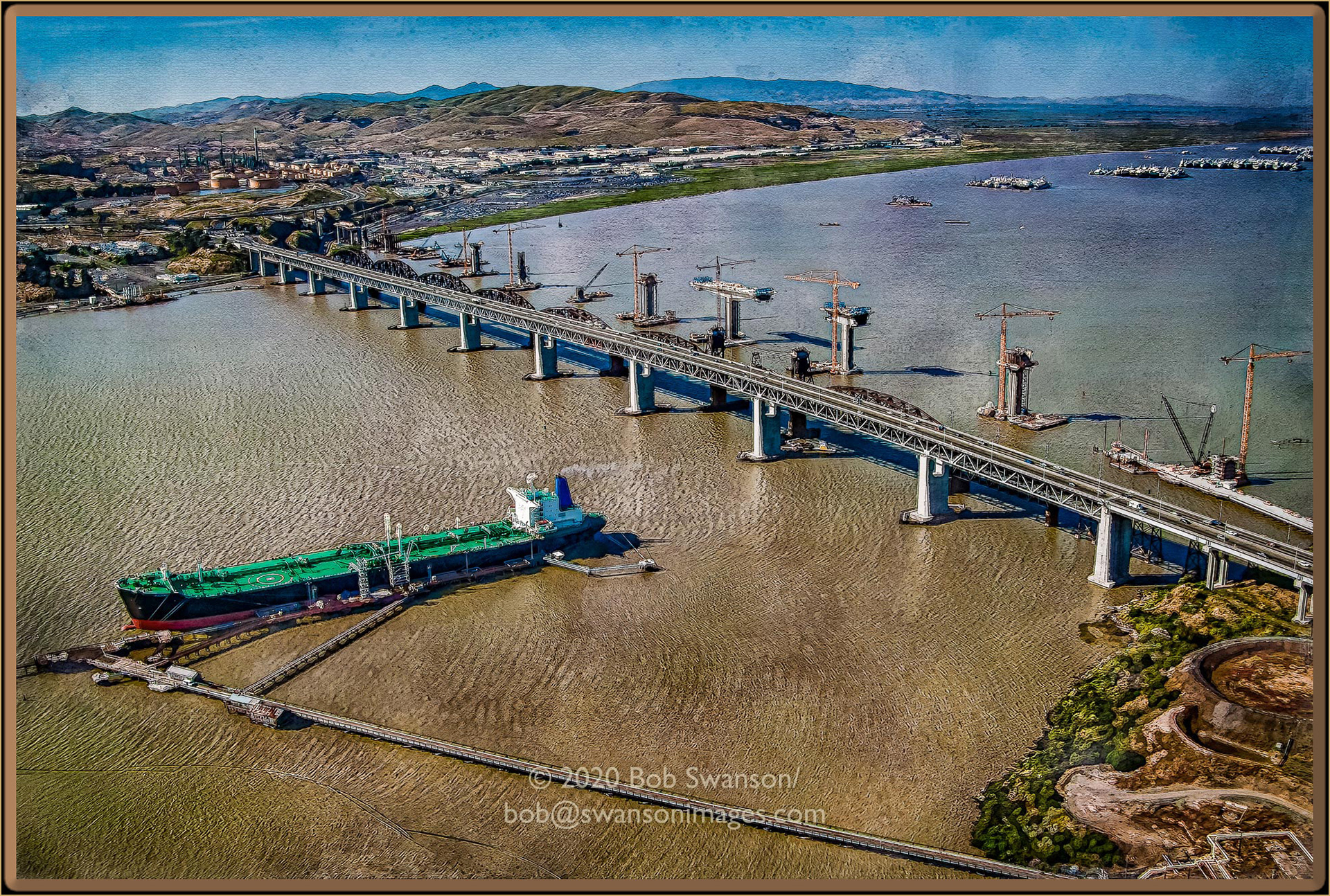 The Sacrilegious Sacrament to the River A tanker toy floating, fueling the heating of the world. As bridges go up, and come down. We are watching and melting as I witness from the sky. Belying this strange and terrible beauty.
